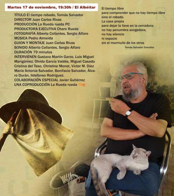 Por ELOÍSA OTERO.— Este martes 17 de noviembre se proyecta en el Teatro El Albéitar (León) el documental «El tiempo robado», en el que Juan Carlos Rivas ha recogido testimonios sobre el fallecido poeta zamorano Tomás Salvador González para realizar el «retrato polifónico de un ser humano excepcional». La proyección se vincula a la exposición de ‘Poesía visual’ de Tomás Salvador que se abrirá al público el miércoles 18 de noviembre en las salas de El Albéitar, y a la presentación del libro póstumo “De Aleda a Aldea”, editado por la Universidad de León.