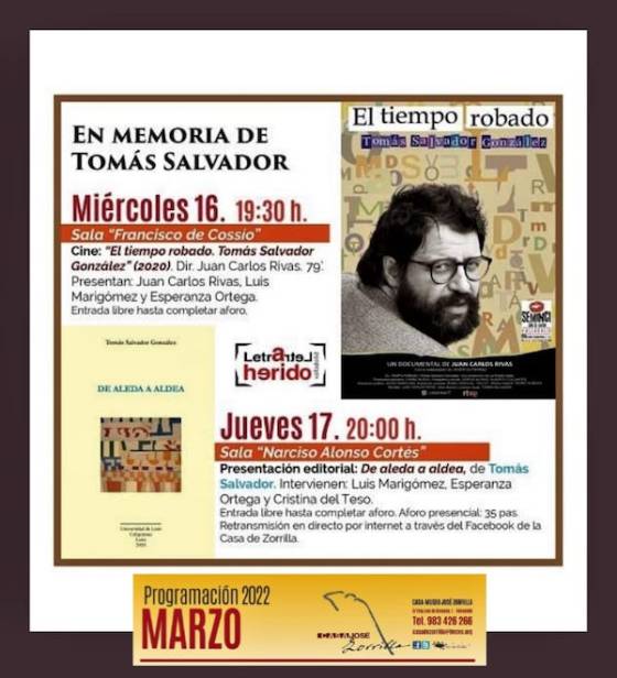 Dos actos en memoria el poeta y escritor zamorano Tomás Salvador González (1952-2019) se sucederán esta semana en la Casa de Zorrilla, en Valladolid: la proyección del documental ‘El tiempo robado’ (miércoles 16 de marzo) y la presentación del libro póstumo ‘De aleda a aldea’, que recopila su poesía visual (el jueves 17 de marzo).