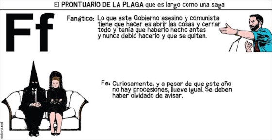 El dibujante leonés Ernesto Rodera suele elaborar sus diccionarios viñeteros en agosto. «Pero, como este mes es singular de cojones también, pues, al lío. Luego me arrepiento. Sobre todo cuando llega la letra ka o la uve doble…», escribe bajo la primera viñeta (la de la letra A) de su «Prontuario de la Plaga».