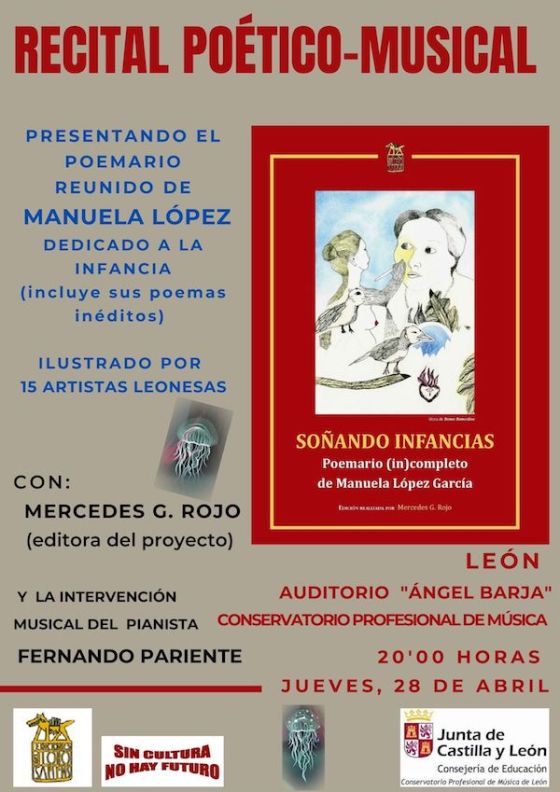 Los poemas del libro recopilatorio “Soñando infancias” (Ediciones del Lobo Sapiens), que la cacabelense Manuela López dedicó a los más pequeños, llenarán este jueves 28 de abril, a las 20 horas, el Auditorio Ángel Barja del Conservatorio de Música de León, en el camino de recuperación de su obra para los lectores de hoy. La entrada es libre y gratuita hasta completar aforo.