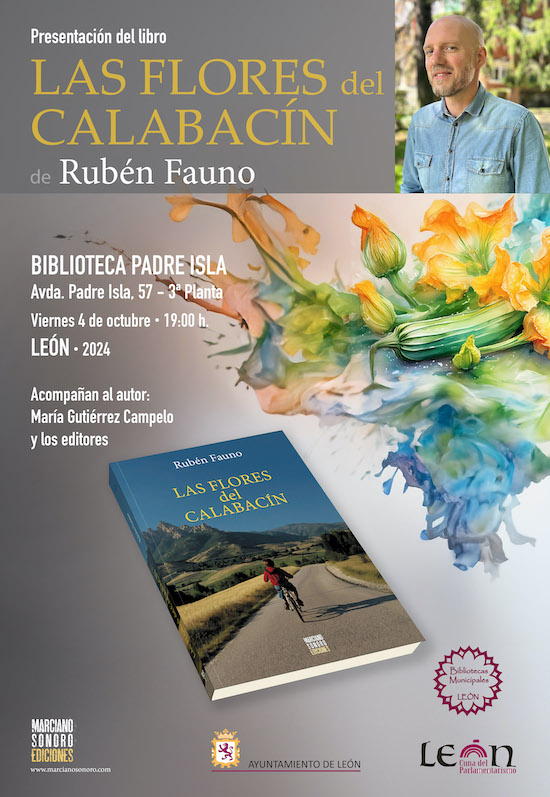 Este viernes 4 de octubre, a las 19 horas, la editorial Marciano Sonoro presenta en la Biblioteca Padre Isla de León (Padre Isla 57, planta 3) el libro ‘Las flores del calabacín’, la primera novela del profesor leonés Rubén Fauno. El autor estará acompañado por María Gutiérrez Campelo y por los editores, Cristina Pimentel y Jesús Palmero.