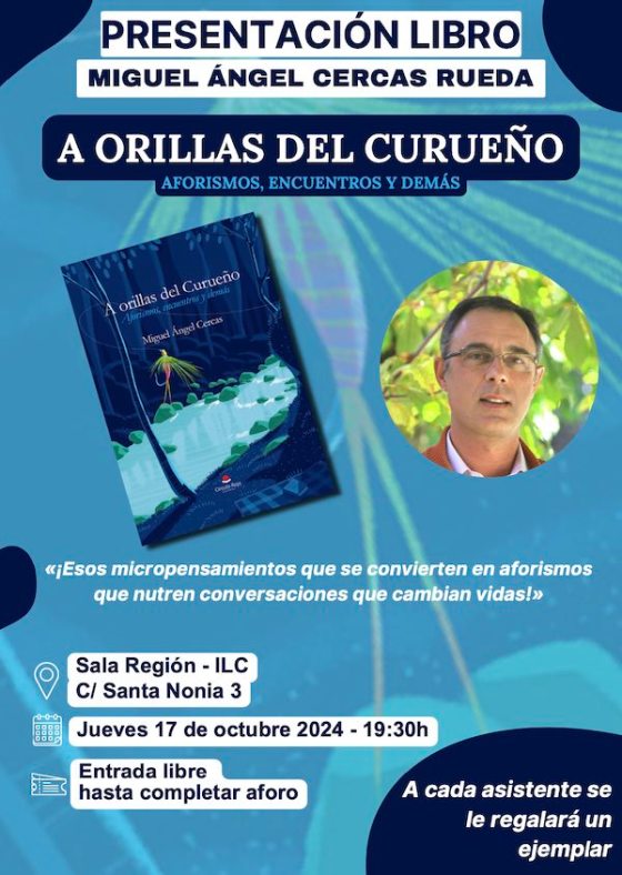 Este jueves 17 de octubre , a las 19:30 horas, el escritor y asesor financiero Miguel Ángel Cercas Rueda presentará en la Sala Región del ILC (C/Santa Nonia 3) su tercer libro de aforismos: ‘A orillas del Curueño. Aforismos, encuentros y demás’. La entrada es libre y se regalará un ejemplar a cada asistente.
