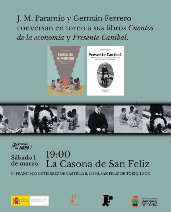 Los autores Germán Ferrero y J. R. Paramio conversarán los días 1 y 2 de marzo en torno a sus nuevos libros, recientemente publicados: Presente caníbal y Cuentos de la economía. El sábado día 1, a las 19 horas, estarán en La Casona de San Feliz de Torío, y el domingo 2 a las 12,45 horas, en la Plaza Mayor de Cacabelos, donde charlarán y firmarán ejemplares en el marco del Mercado campesino, con intercambio de ropa y semillas.