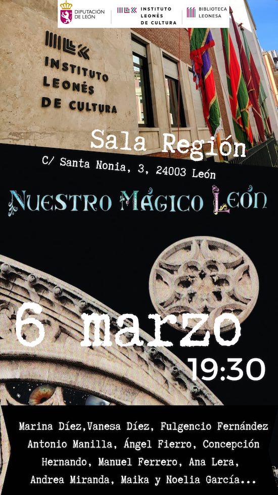 La Sala Región del Instituto Leonés de Cultura acoge este jueves 6 de marzo, a las 19:30 horas, la presentación del libro colectivo «León Mágico» (Mariposa Ediciones), en el que autores como Ana Lera, Andrea Miranda, Ángel Fierro del Valle, Antonio Manilla, Concepción Hernando, Fulgencio Fernández, Marina Díez, Manuel Ferrero López del Moral y Vanesa Díez transportan al lector a un León de cuentos y enigmas, de pastores y brujas, de caminos que llevan a mundos olvidados.