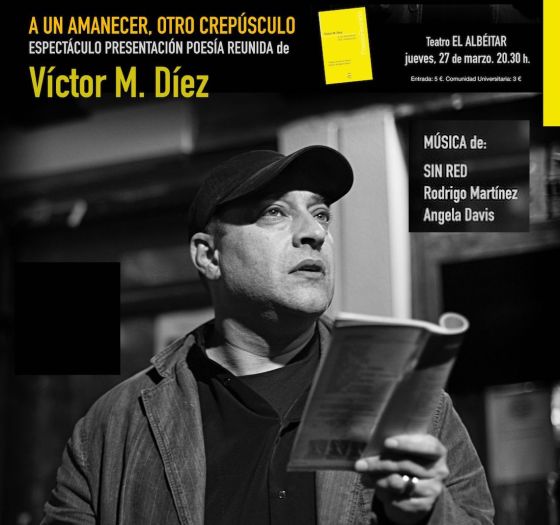 El próximo jueves 27 de marzo, a las 20.30 horas, en el Teatro El Albéitar de la Universidad de León, el poeta Víctor M. Díez presentará el libro A un amanecer, otro crepúsculo (Editorial Dilema), su poesía reunida, con un espectáculo poético y musical en el que estará acompañado por grupos y músicos señeros en su trayectoria: Sin Red, Angela Davis y Rodrigo Martínez. Junto al autor estará, además, el periodista Antonio Marcos, responsable del prólogo. // El libro se presentará en Madrid el próximo 29 de marzo.