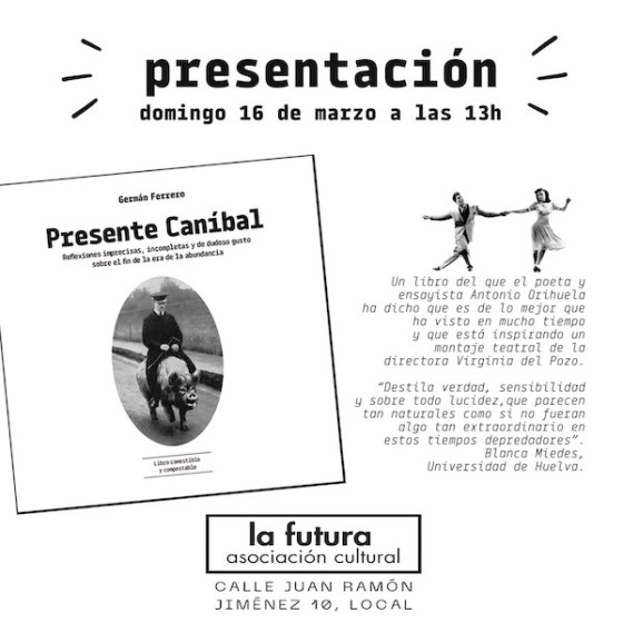 «Presente Caníbal. Reflexiones imprecisas, incompletas y de dudoso gusto sobre el fin de la era de la abundancia». Así se titula el primer libro del ilustrador y profesor de economía leonés Germán Ferrero, alma y voz del grupo leonés La Jari. Y sí, es un libro un poco raro… a la vez que crítico y físicamente hermoso, en el que el autor conjuga de alguna manera todas sus facetas.