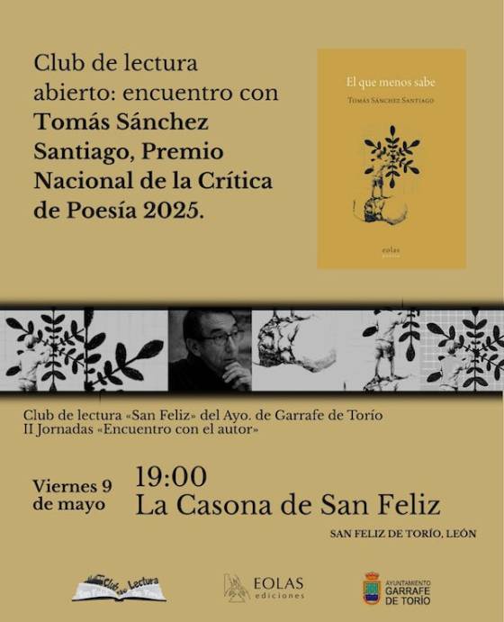 Semana literaria intensa en la localidad leonesa de San Feliz de Torío. Este miércoles 7 de mayo, a las 19,30 horas, tendrá lugar una conversación con Olaf Pla Gracia en Espacio Factor, y el jueves 8, en el mismo lugar y a la misma hora, conversación con el periodista Francisco J. Martínez Carrión; ambos hablarán sobre sus últimos libros. El viernes 9 se celebrarán dos actividades a las siete de la tarde: por un lado, en La Casona, habrá un encuentro con el poeta y novelista Tomás Sánchez Santiago, reciente Premio de la Crítica, y por otro, en Espacio Factor, la escritora Raquel Presumido presentará su primera novela.