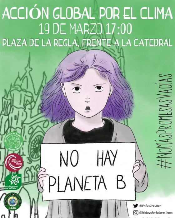 Este viernes 19 de marzo, a las 17:00h, el colectivo Fridays for Future León, con la colaboración de Ecologistas en Acción y Familias por el Clima, ha organizado una sentada en la Plaza de la Regla, frente a la Catedral de León, para «reivindicar la imperiosa necesidad de acción política en materia climática y de manera inmediata».
