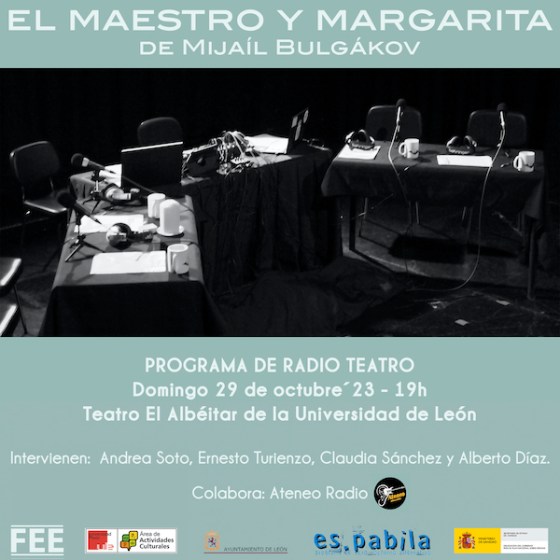 “El maestro y Margarita” del médico, escritor y dramaturgo ruso Mijaíl Bulgakov, es la obra elegida para el tercer programa de radio-teatro que organiza la Feria de Editores con E (FEE). Será este domingo, 29 de octubre, a las 19 horas en el teatro El Albéitar (León). Ante los micrófonos se sentarán Andrea Soto, Alberto Díaz, Rubén Ochoa, Claudia Sánchez y Ernesto Turienzo, y el guion lleva la firma de Magalí Labarta. Entrada libre.