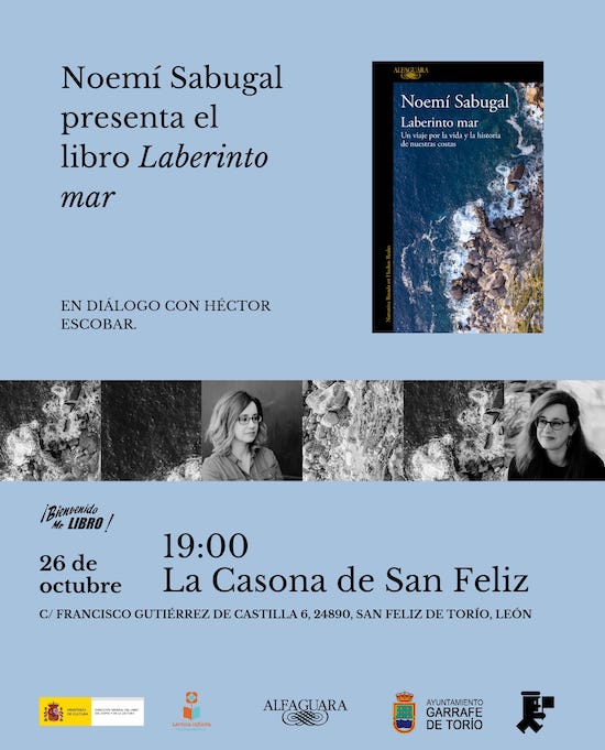 Este sábado 26 de octubre, a las 19 horas, en LA CASONA de San Feliz de Torío (León), tendrá lugar la presentación del libro “Laberinto mar. Un viaje por la vida y la historia de nuestras costas”, del que es autora la periodista y novelista leonesa Noemí Sabugal, que estará acompañada por el fotógrafo Pablo J. Casal y por el editor Héctor Escobar.