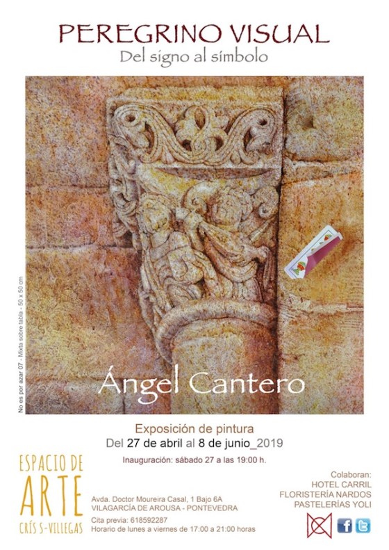 Desde el 27 de abril al 8 de junio de 2019, el pintor leonés Ángel Cantero mostrará sus creaciones en el Espacio de Arte Crís S.-Villegas, en la localidad gallega de Vilagarcía de Arousa (Pontevedra), dentro la exposición titulada «PEREGRINO VISUAL. Del signo al símbolo».