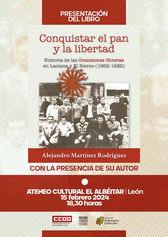 El Ateneo Cultural El Albéitar acoge este jueves, 15 de febrero, a las 18’30 horas, la presentación del libro ‘Conquistar el pan y la libertad. Historia de las Comisiones Obreras en Laciana y El Bierzo (1962-1982)’, escrito por Alejandro Martínez. Además del autor, participarán en el acto, la secretaria general de CCOO León, Elena Blasco, y el responsable de la editorial Marciano Sonoro, Jesús Palmero.