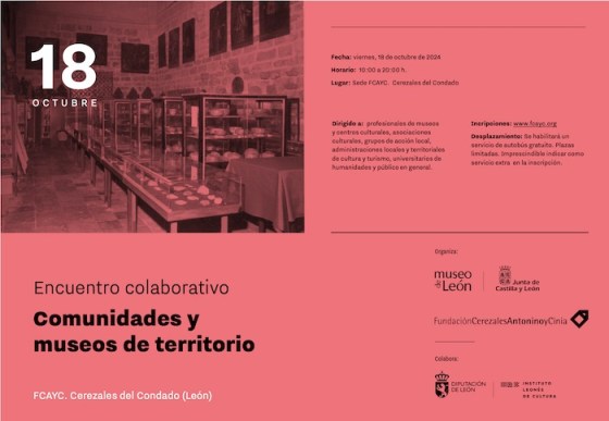 El Museo de León y la Fundación Cerezales han organizado, para la jornada del viernes 18 de octubre de 2024, el encuentro colaborativo «Comunidades y museos de territorio», que se desarrollará de 10 a 20 horas en la sede de la fundación, en Cerezales del Condado. Es necesario inscribirse y se habilitará un servicio de autobús gratuito (plazas limitadas; imprescindible indicar como ‘servicio extra’ en la inscripción).
