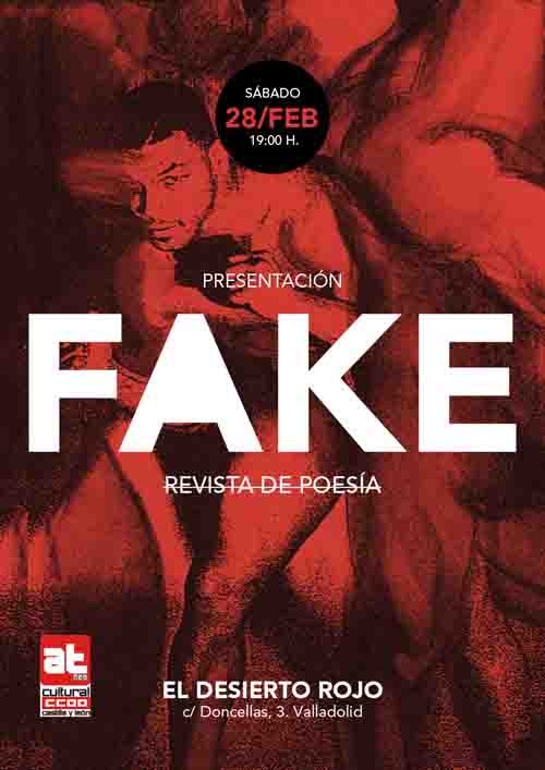 El bar El Desierto Rojo acoge el sábado 28 de febrero, a las siete de la tarde, la presentación en Valladolid de la revista leonesa de poesía FAKE. Se encargarán de ello Irune Vidal y Carlos Pérez-Alfaro por parte de los editores y Chapu Valdegrama e Ignacio Fernández Herrero en las lecturas.