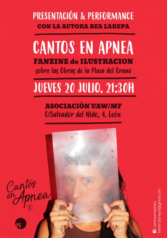 La asociación UAW/MF (C/ Salvador del Nido, 4. León) acoge el jueves 20 de julio, a las 21.30 horas, la presentación del fanzine “Cantos en Apnea», definido por su autora, Bea Larepa, como «un grito de auxilio, un último aliento que nos haga recapacitar sobre la situación de la Plaza del Grano. Un canto sin idioma que pretende llegar hasta los que no quieren escuchar”.