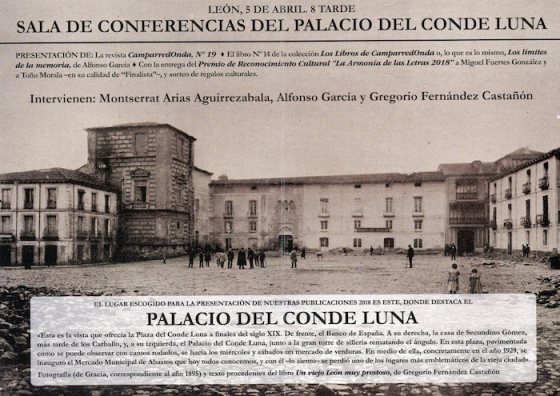 El jueves 5 de abril, a las 20 horas, en el Palacio del Conde Luna (León), se presentarán las nuevas publicaciones de CamparredOnda, el proyecto editorial que dirige Gregorio Fernández Castañón. Además del nº 19 de la revista CamparredOnda, verá la luz un nuevo libro de Alfonso García, «Los límites de la memoria», primorosamente editado, y se procederá a la entrega de los Premios de Reconocimiento Cultural «La Armonía de las Letras 2018», que en esta edición han recaído en Miguel Fuertes González y, en calidad de finalista, en Toño Morala. Entrada libre. Habrá sorteo de regalos.