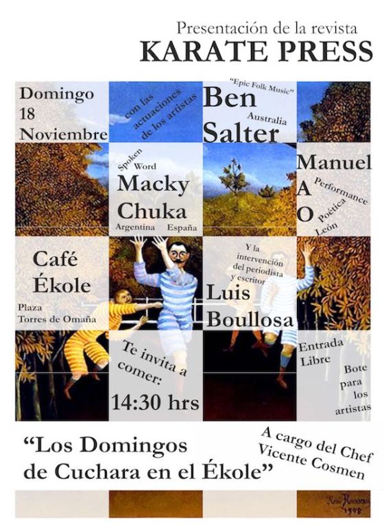 El café Ékole (León) acoge este domingo 18 de noviembre, a las 14.30 horas y con un plato de purrusalda, la presentación del nº 5 de la revista contracultural Karate Press, con las actuaciones de Ben Salter (Australia / «Epic Folk Music») y Manuel AO Ortega (performance poética). Una buena manera de unirse a los «Domingos de cuchara» del Ékole.
