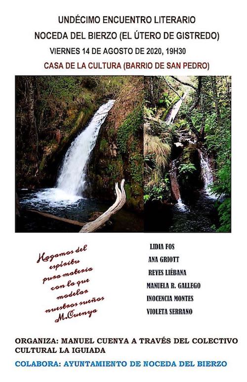 Este viernes 14 de agosto, a las 19:30 horas, se celebrará en la Casa de la Cultura de la localidad berciana de Noceda (barrio de San Pedro), con las medidas de seguridad pertinentes, el XI Encuentro Literario, en el que participarán las siguientes poetas y narradoras: Lidia Fos, Reyes Liébana, Ana Griott, Manuela R. Gallego, Inocencia Montes y Violeta Serrano.