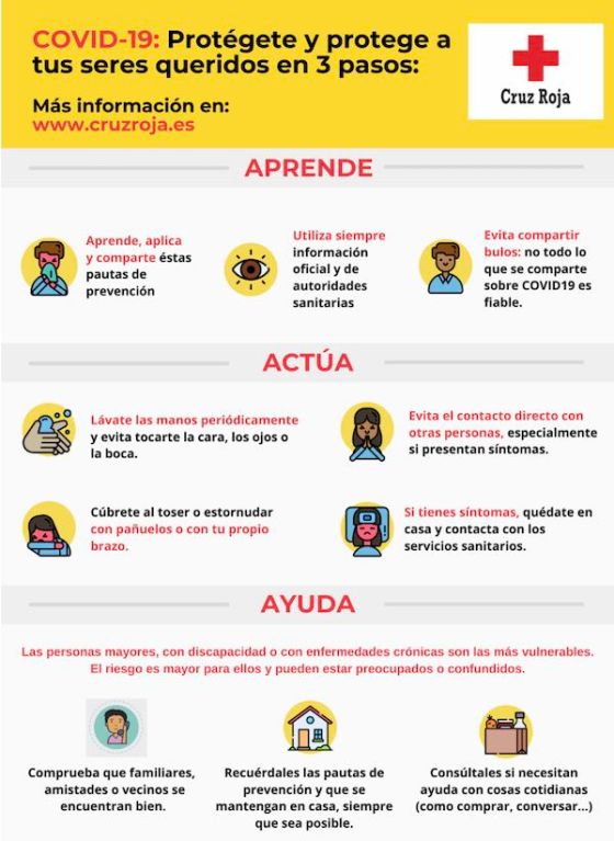 Con el objetivo de seguir formando a su personal laboral, voluntariado y población en general, Cruz Roja publica píldoras informativas con información básica sobre el COVID-19, medidas de prevención, procedimientos para actuar ante pequeños accidentes y recomendaciones que ayudarán a cuidar la salud emocional.