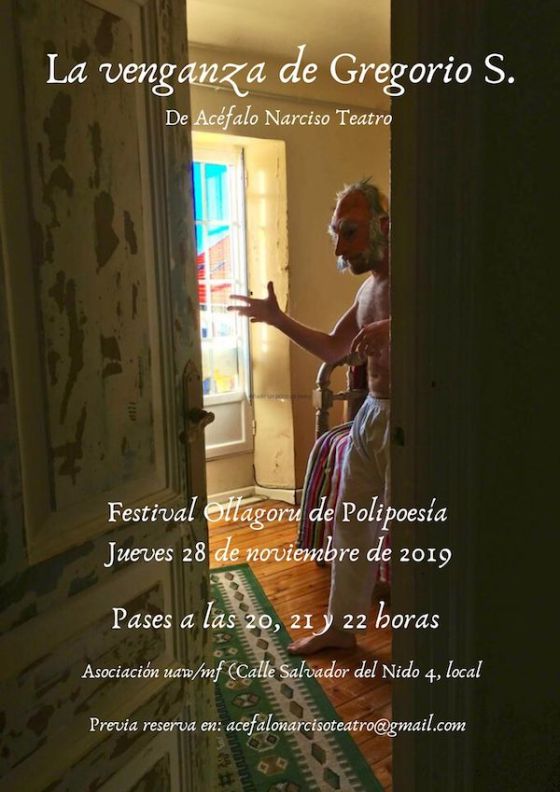 OLLAGORU, el festival independiente de polipoesía, continúa este jueves 28 de noviembre, en León, con la puesta en escena de una pieza de microteatro, «Gregorio S.», a cargo de Manuel Alonso Ortega, de la compañía Acéfalo Narciso Teatro. Habrá tres pases: a las 20, a las 21 y a las 22 horas, en la sede de la Asociación UAW/MF (calle Salvador del Nido 4 local). La entrada cuesta 3 euros, y debido al poco aforo de la sala, conviene hacer reserva previa.