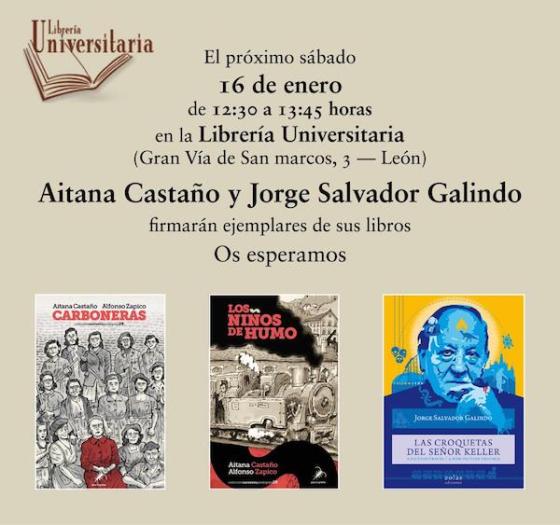 Este sábado 16 de diciembre, de 12.30 a 14 horas, en la Librería Universitaria (Gran Vía de San Marcos 3), en León, se llevará a cabo la firma de los libros “Carboneras” y “Los niños de humo” de Aitana Castaño, y “Las croquetas del señor Keller” de Jorge Salvador Galindo.