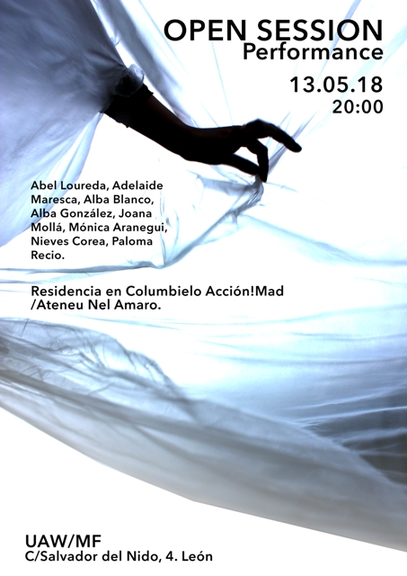 La artista multidisciplinar salmantina Alba González, afincada en León desde hace varios años, realizará este domingo 13 de mayo en la sala de la asociación UAW/MF (C/ Salvador del Nido, 4. León), una Open Session Performance junto a otras cinco artistas involucradas en la residencia artística que han llevado a cabo a lo largo de toda esta semana en la localidad de Columbiello (Pola de Lena, Asturias). Tendrá lugar a las 20: 00 horas.
