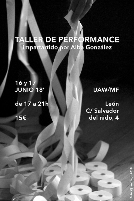 La artista Alba González impartirá un Taller de Performance este fin de semana de mediados de junio (días 16 y 17) en la sede de la asociación leonesa UAW/MF. Para apuntarse es necesario inscripción previa. Hay 15 plazas disponibles, y el precio es de 15 euros. Además, el domingo 17 de junio, a las 20 horas, tendrá lugar una presentación abierta al público de los resultados del taller.