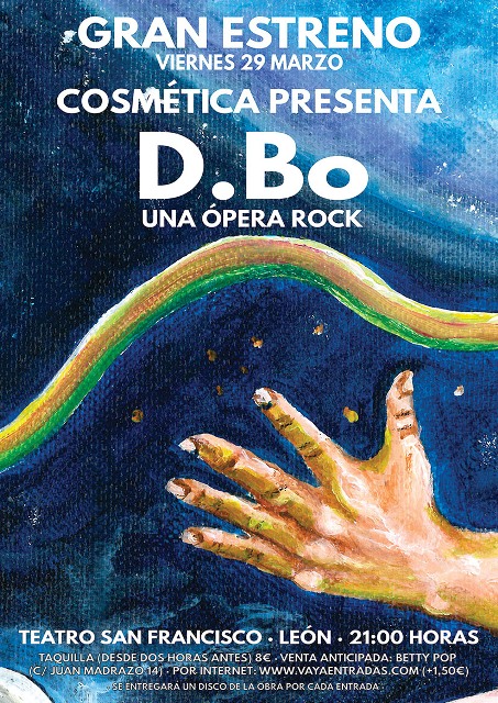 El grupo leonés Cosmética presenta este viernes 29 de marzo en el Teatro San Francisco, la versión escénica de su primer disco: la ópera rock ‘D.Bo’, la primera obra de este estilo en Castilla y León. Un trabajo ecléctico que fusiona diversos estilos musicales desde el rock hasta el jazz y la música clásica con sonoridades espaciales, barroco y glam en una versátil mezcla para contar una historia de pasión, traición, desengaño y triunfo inesperado ante las masas. Será a las 21:00 horas, con entradas a 8 euros.
