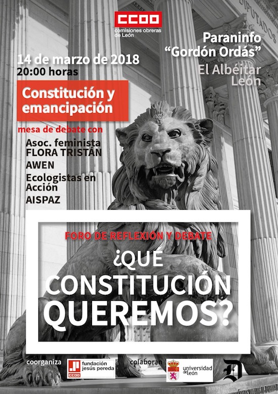 Con un debate sobre Constitución y emancipación continúa el ciclo “¿Qué Constitución queremos?”, organizado por CCOO de León y por la Fundación Jesús Pereda. En esta ocasión reunirá en torno a una misma mesa a representantes de Asociación Feminista Flora Tristán, AWEN, Ecologistas en Acción y AISPAZ para debatir sobre la Constitución que queremos. Será el miércoles 14 de marzo, a las 20 horas, en el Paraninfo “Gordón Ordás” del Pabellón Albéitar (Universidad de León). Entrada libre.