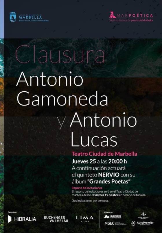 Los poetas Antonio Gamoneda y Antonio Lucas protagonizarán el próximo jueves 25 de abril de 2024 la clausura del VII Festival de Poesía de Marbella (MARPOÉTICA) con un recital, seguido de la actuación del quinteto Nervio con su álbum «Grandes Poetas».