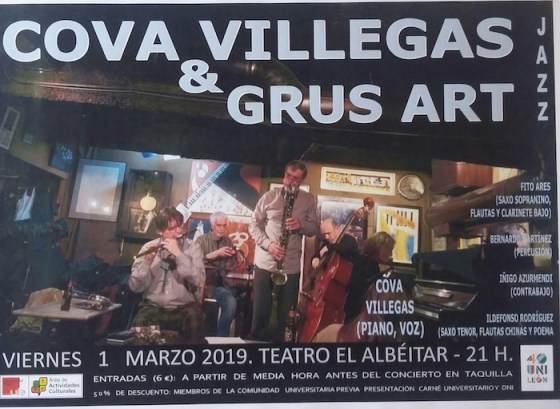 La asturiana Cova Villegas se suma como cantante y pianista al dúo de música improvisada Grus Art –formación gallega (Fito Ares & Bernando Martínez) que bebe en sus orígenes del free jazz de los 60– y, en reunión además con el contrabajista Iñigo Azurmendi y el saxofonista Ildefonso Rodríguez, ofrecerán un concierto en quinteto en el teatro leonés El Albéitar, este viernes 1 de marzo, a las 21 horas. Entradas a 6 € a partir de media hora antes del concierto en taquilla (50% de descuento a los miembros la Comunidad Universitaria).