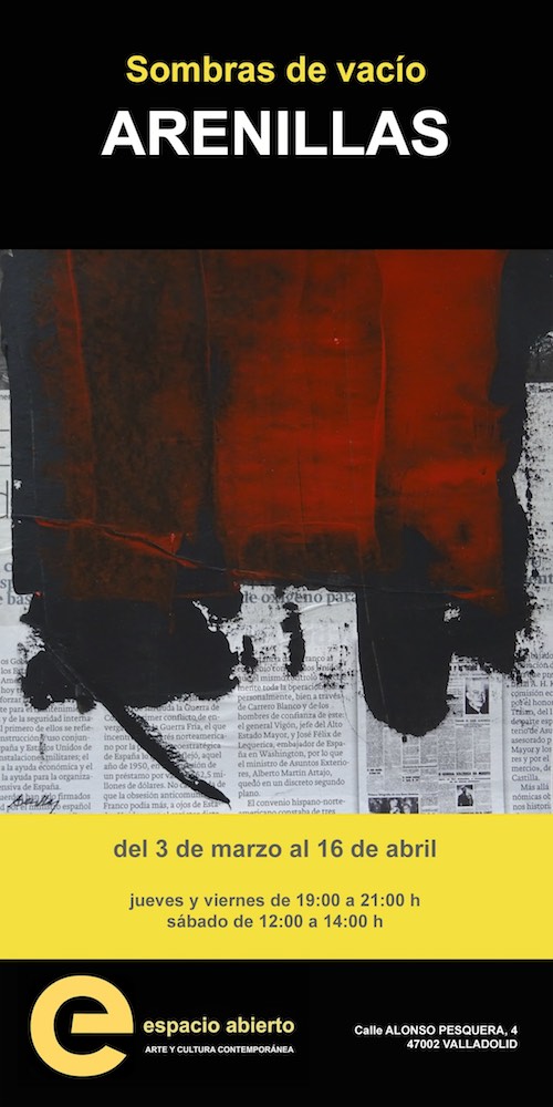 espacio abierto presenta en Valladolid la exposición «Sombras de vacío», en la que el artista Armando Arenillas muestra una serie de pinturas en formato papel con las que sumerge al espectador en «atmósferas y ejercicios de texturas que invaden el soporte y que se abren hacia su interior». La inauguración será el jueves 3 de marzo a las 19:30 horas.