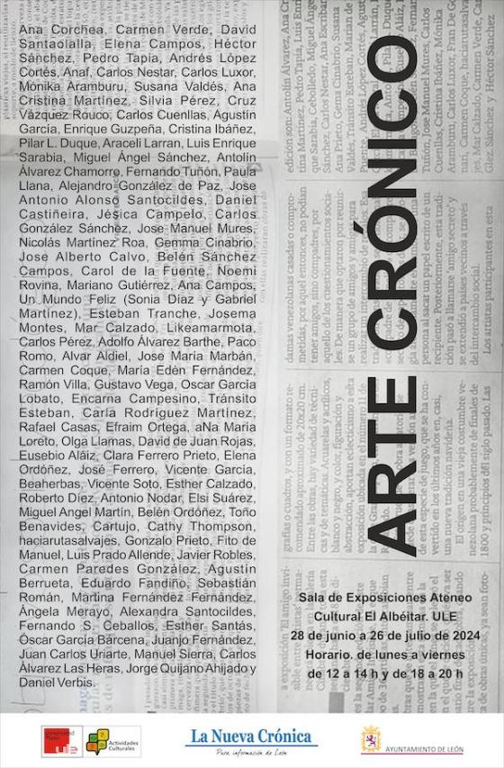 La exposición ‘Arte Crónico’, en las salas del Ateneo Cultural El Albéitar, muestra esculturas, instalaciones, fotografías, pinturas y otras piezas de un centenar de artistas, que rinden así homenaje al diario leonés ‘La Nueva Crónica’ en su décimo aniversario. Se puede visitar hasta el 26 de julio.