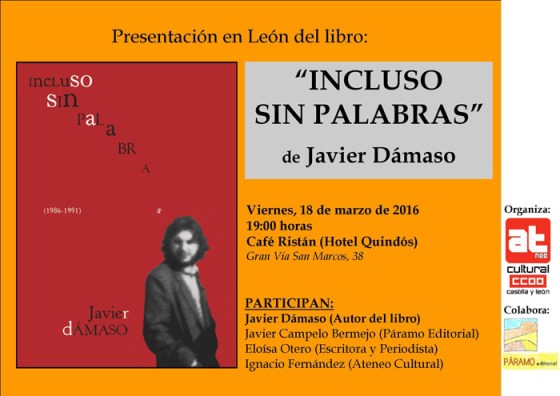 El viernes 18 de marzo, a las 19 horas, en el Café Ristán (Hotel Quindós, León), tendrá lugar la presentación del libro “Incluso sin palabras”, del que es autor el jurista y escritor vallisoletano Javier Dámaso. Además del autor, participarán también en el acto Javier Campelo, por parte de Páramo Editorial, la periodista y escritora Eloísa Otero e Ignacio Fernández, como representante del Ateneo Cultural Jesús Pereda de CCOO, que es la entidad organizadora.