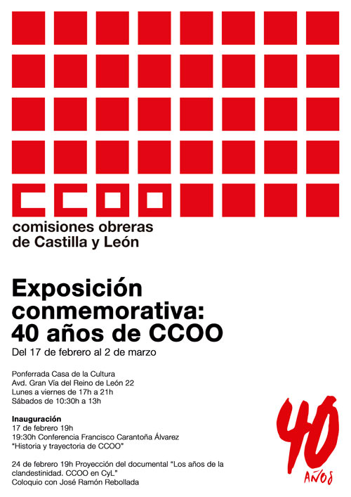 Este viernes, 17 de febrero, a las 19 horas, se inaugura en la Casa de Cultura de Ponferrada la exposición conmemorativa 40 años de CCOO. Organizada por el Ateneo Cultural “Jesús Pereda”, la muestra recuerda la historia del sindicato desde la asamblea de Barcelona en 1976 y desde la legalización del sindicato en abril de 1977.