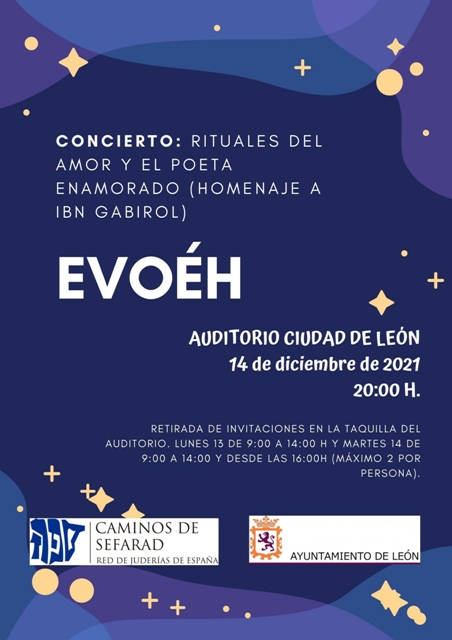 El Auditorio de León acoge este martes 14 de diciembre, el espectáculo de Evoéh,‘Rituales del Amor y el Poeta Enamorado’. Una iniciativa artística de Ariana Barrabés y Jesús Olivares que combina música y danza en el que rinde homenaje al filósofo y poeta judío Ibn Gabirol. La actuación está organizada por la Red de Juderías de España y el Ayuntamiento de León. Comenzará a las 20:00 horas, con entrada gratuita.