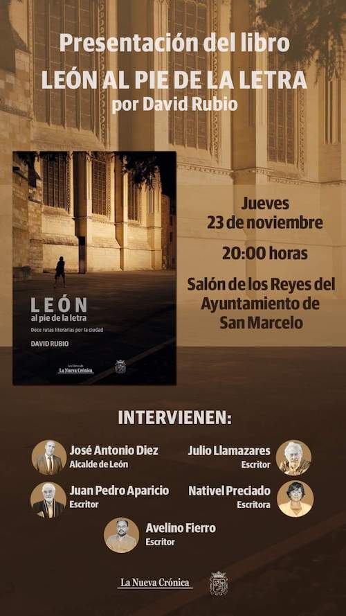 Acaba de ver la luz un nuevo libro del periodista y escritor leonés David Rubio: ‘León al pie de la letra’, editado por La Nueva Crónica y el Ayuntamiento de León, en el que se recogen un total de doce rutas literarias por la ciudad. // Las doce rutas han sido trazadas a partir de obras y escritores relacionados con la capital leonesa: la Pícara Justina, Luis Mateo Díez, Nativel Preciado, Antonio Pereira, Francisco Umbral, Juan Pedro Aparicio, Antonio Gamoneda, Victoriano Crémer, José María Merino, Noemí Sabugal, Avelino Fierro, Francisco Pérez Herrero y Julio Llamazares.