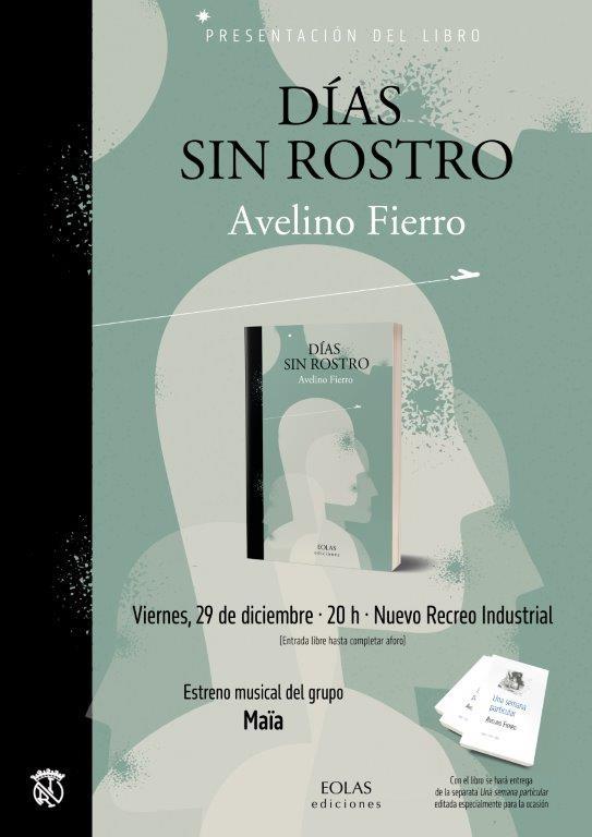 Este viernes 29 de diciembre, a las 20 horas, el salón de actos del Nuevo Recreo Industrial, junto a la leonesa Plaza de las Palomas, acogerá la presentación del libro ‘Días sin rostro’ (Eolas Ediciones, 2023), del que es autor Avelino Fierro. En el acto intervendrá el grupo musical Maïa. Entrada libre hasta completar el aforo.