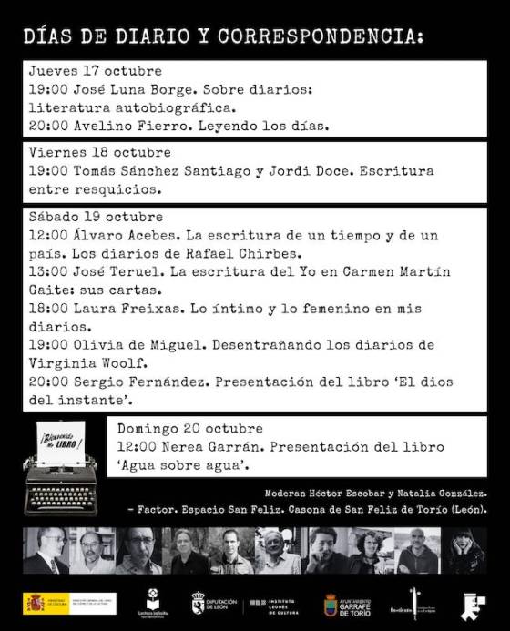 Este jueves 17 de octubre arranca un nuevo ciclo literario en La Casona de San Feliz de Torío (León), «Días de diario y correspondencia», que se prolongará hasta el domingo día 20. Participarán José Luna Borge y Avelino Fierro (el jueves 17), Tomás Sánchez Santiago y Jordi Doce (viernes 18), Álvaro Acebes, José Teruel, Laura Freixas, Olivia de Miguel y Sergio Fernández (sábado 19) y Nerea Garrán (domingo 20). Entrada libre.