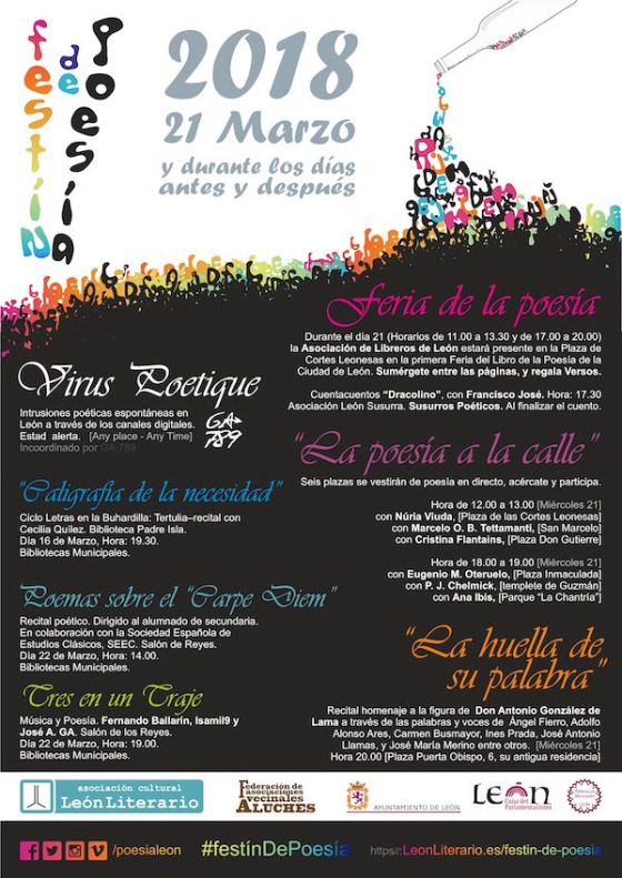 ‘Virus Poetique’, ‘La huella de su palabra’, ‘La poesía a la calle’ y la ‘Feria de la Poesía’ son algunas de las actividades previstas con motivo de la celebración este 21 de marzo del Día Mundial de la Poesía. Una cita en la que participa el Ayuntamiento de León en colaboración con la Asociación de Libreros, León Literario, Ágora de Poesía y la Federación de Asociaciones de Vecinos Aluche.