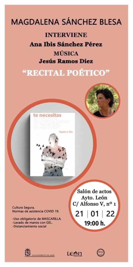 El próximo viernes 21 de enero el Salón de Actos del Ayuntamiento de León (entrada por la calle Alfonso V) acoge un recital poético de Magdalena Sánchez Blesa. La poeta murciana estará acompañada por Ana Ibis Sánchez y la música de Jesús Ramos Díez para presentar su nuevo libro «Te necesitas». La actividad, organizada por las Bibliotecas Municipales, comenzará a las 19:00 horas y la entrada es libre y gratuita.