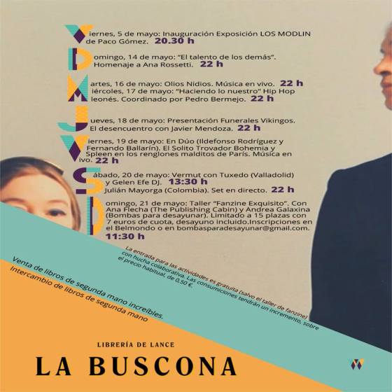 En la tienda La Mona se Viste de Seda se inaugura Retro Retratos, 12 dibujos de la artista Crixtina para Ediciones Chelsea. Y en el bar Belmondo se podrá ver la exposición de Paco Gómez para No Photo sobre «Los Modlin». Además, el Belmondo se convierte estos días en La Buscona, librería de lance, con un buen surtido de actividades literarias. Todo ello en el marco de la XL Feria del Libro de León.