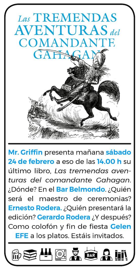 Este sábado 24 de febrero, a las 14 horas, se celebrará en el Bar Belmondo-La Buscona (León) una fiesta-presentación del libro «Las tremendas aventuras del comandante Gahagan», de W. M. Thackeray. Se trata de una novela divertidísima del siglo XIX traducida por vez primera al español (con sus difíciles juegos de lenguaje) y recién editada por el exquisito sello leonés Mr. Griffin. En el acto, el dibujante Ernesto Rodera actuará como maestro de ceremonias, mientras que Gerardo Rodera presentará la edición. Como colofón y fin de fiesta, la dj Gelen EFE pinchará la mejor música.