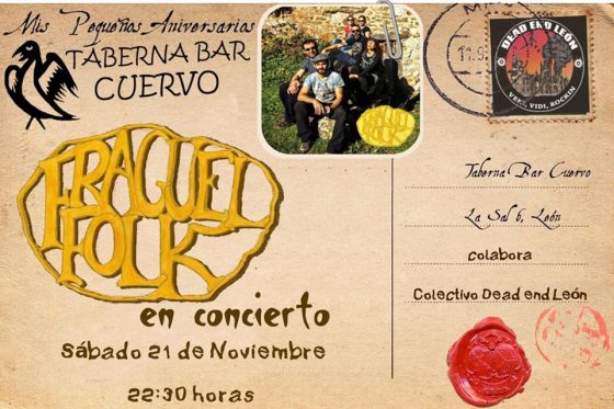 Este sábado 21 de noviembre, en la Taberna Bar Cuervo (León) habrá una actuación de la banda berciana Fraguel Folk, con entrada libre a partir de las 22:30 horas.