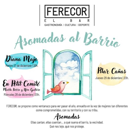 Para despedir el año, Ferecor, el bar (Av. Padre Isla 130, en León) ha programado tres propuestas musicales, bajo el título «Asomadas al barrio, envueltas en voces de mujeres tan diferentes como comprometidas con su territorio y con su tribu: Diana Majo (día 27 de diciembre, a las 20 horas), En Petit Comité, con Marta Fierro y Nico Guitare (día 28, 20 h.) y Pilar Cañas (día 30, 20 h.). Ellas cantan, ellas cuentan… a qué suena el barrio, la vecindad.