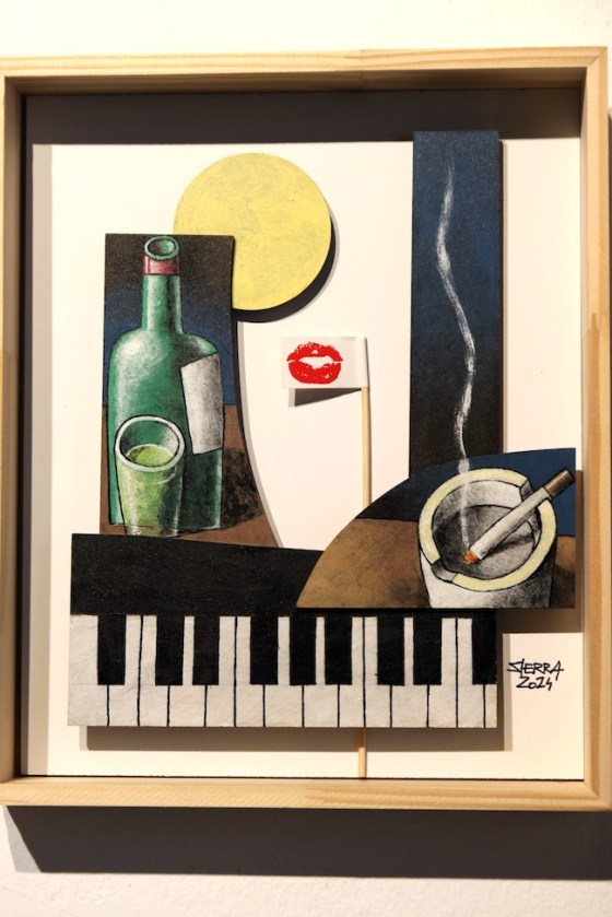 Por ISAAC MACHO.— Si compramos una batidora de las que mezclan alimentos, pero, en su lugar, ponemos la tragedia de la Dana, el genocidio acumulado en Palestina, la peregrina idea de la Seminci de retocar los labios para actualizar su imagen corporativa, los encuentros y desamores, la lucha entre el pensamiento y la acción con todas las músicas posibles, y le damos al interruptor… podemos estar cerca de comprender la exposición que el pintor leonés Manuel Sierra presenta en el bar-restaurante Puerto Chico de Valladolid.