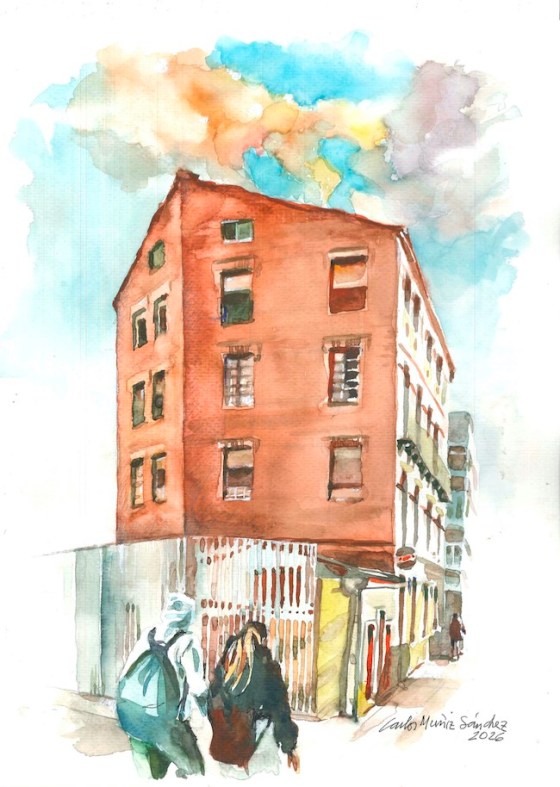 Por CARLOS MUÑIZ SÁNCHEZ.— El arquitecto leonés nos envía una Oda a la esquina de una casa singular ubicada en el viejo barrio ferroviario de León capital, junto al ya desaparecido «paso a nivel» del Crucero. «La casa es familia de otras cercanas de la calle Astorga por la personalidad humilde de sus formas y materiales y que, hoy, dan su mejor cara a la cicatriz casi curada del nuevo pasillo sobre el ferrocarril. Curiosamente estas casas están protegidas por la directriz urbanística, pero tristemente se han olvidado de ésta que ha quedado abandonada a su suerte», señala el autor, que ilustra el texto, como es su costumbre, con un apunte acuarelado.