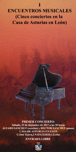 Por CAMINO SAYAGO.- La Casa de Asturias en León ya tiene listo el programa de actividades para estas fiestas navideñas. E incluye, por primera vez, el ciclo de conciertos ‘Encuentros Musicales’. Serán cinco, a razón de uno al mes y siempre en sábado, desde diciembre de 2017 hasta abril de 2018. El primero, este 23 de diciembre a las 20:00 horas, estará protagonizado por por los hermanos Álvaro y b>Hector Sánchez Ruíz, al saxofón y al piano respectivamente.