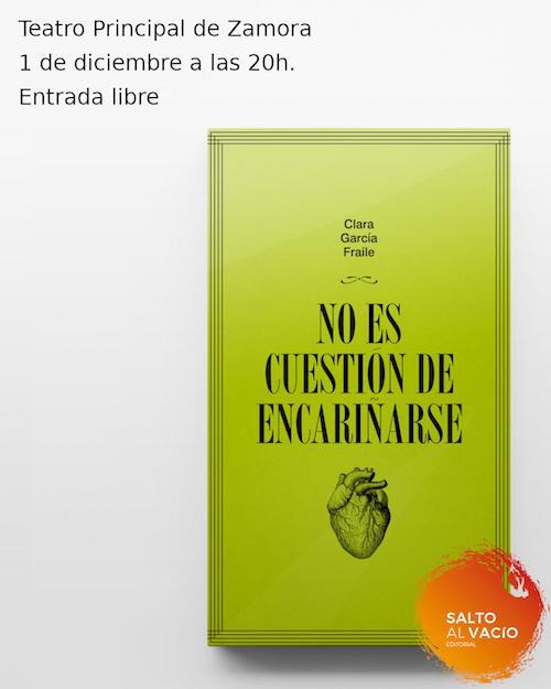 La artista zamorana Clara García Fraile presenta su primera publicación, «No es cuestión de encariñarse» (Salto al Vacío Ed.) en el hall del Teatro Principal de Zamora este jueves 1 de diciembre, a las 20 horas. El libro es un guiño a la estrecha relación con el teatro y las artes escénicas, elevadas a gran metáfora del mundo. Acompañará a la autora Clara Ponte, una de las editoras de Salto al Vacío. Se podrá seguir el acto en directo por internet, en streaming…