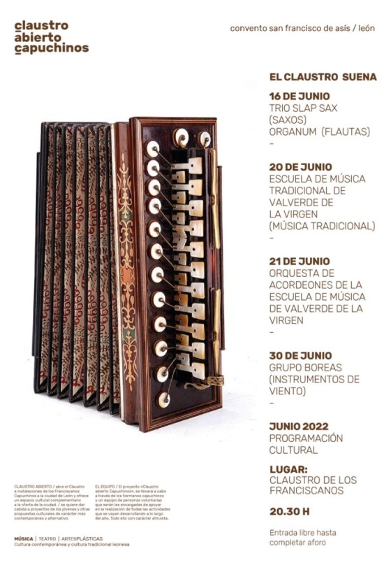 Claustro Abierto Capuchinos (Convento de San Francisco de Asís, en León) pone en marcha el Programa Claustro abierto «Expresa», con cuatro actuaciones de música, teatro, narración oral… los jueves del mes de julio a las 21 horas. Además, hasta el 30 de agosto se podrá visitar la exposición de pintura «Peripatético 2019-2022», del artista leonés Juan Rafael.